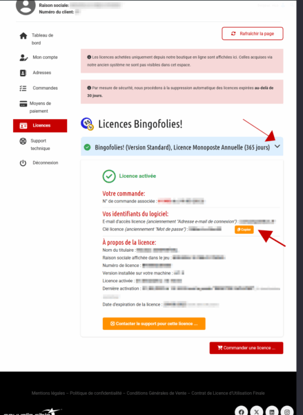 1. Après avoir acheté votre licence Bingofolies ! sur notre site internet, allez dans la section “Licences” par le menu principal ou par le menu latéral gauche de votre compte client.